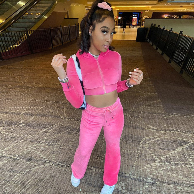 Introducing our newest and most fashionable tracksuit yet- the Hooded Coats Crop Tops+Flare Trousers! This casual yet chic two-piece set is perfect for any woman who wants to look stylish and feel comfortable at the same time. The soft velvet material is ideal for fall and winter weather, and the zip-up hooded coat will keep you warm and cozy all season long. The crop top is the perfect way to show off your figure, and the flare trousers are both flattering and fashionable. This set is available in a variety of colors, so you can find the perfect one to match your style. Don't miss out on this must-have tracksuit- order yours today!